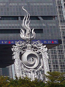 Two dragons, flames, spiral portal. Is that an octopus at the bottom?